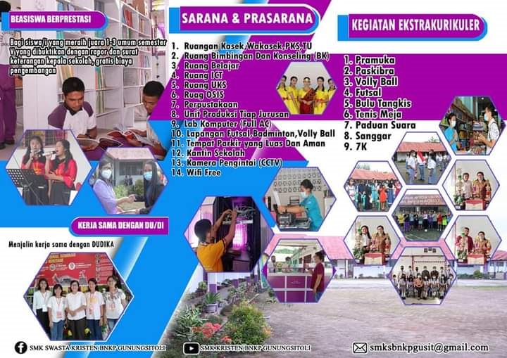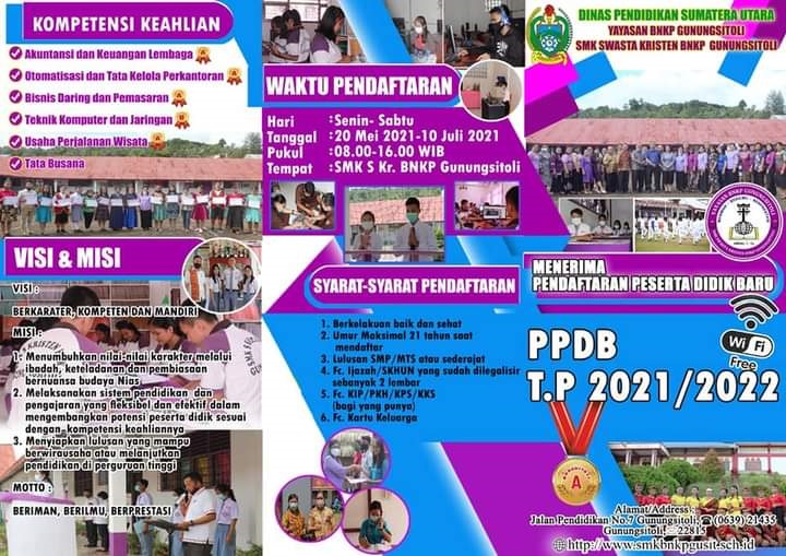 SMK Swasta Kristen BNKP Gunungsitoli terus berusaha untuk pada tahun 2021/2022 ini kembali membuka Penerimaan Peserta Didik Baru, dengan 6 Jurusan /Kompetensi keahlian terbaik yang di Bimbing oleh Guru -Guru yang profesional pada Bidangya
